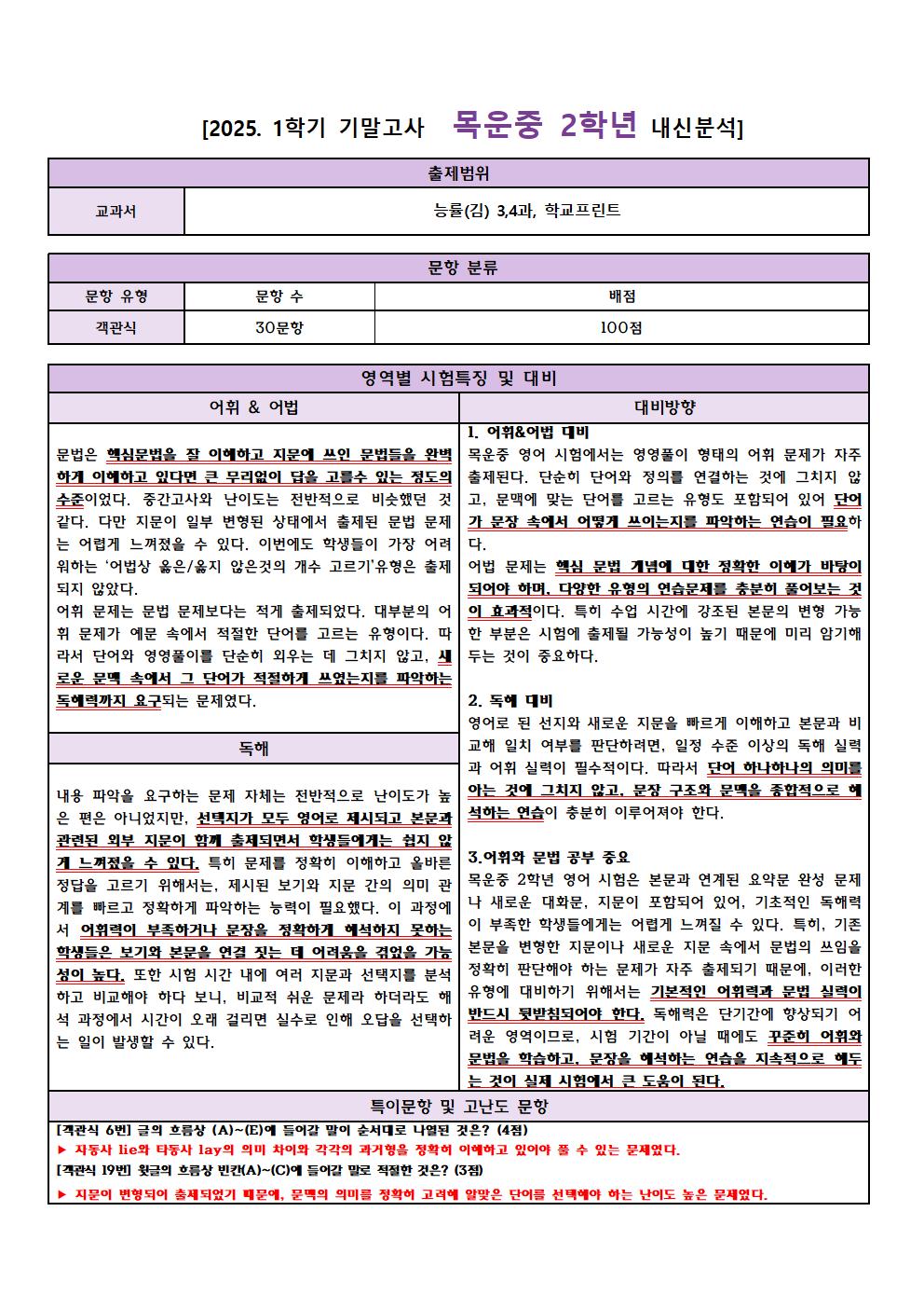 [목운중2] 25' 1학기 기말고사 영어 내신분석 및 대비전략