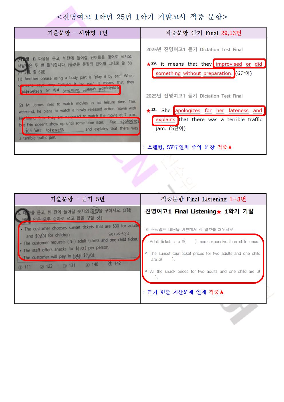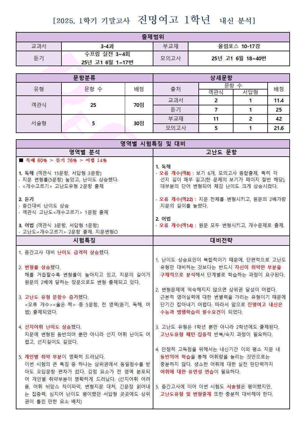 [진명여고1] 25' 1학기 기말고사 영어 내신분석 및 대비전략