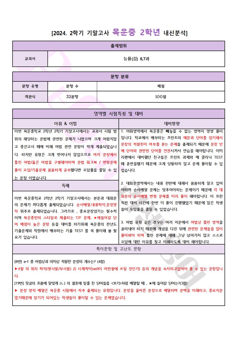 [목운중2] 24' 2학기 기말고사 영어 내신분석 및 대비전략